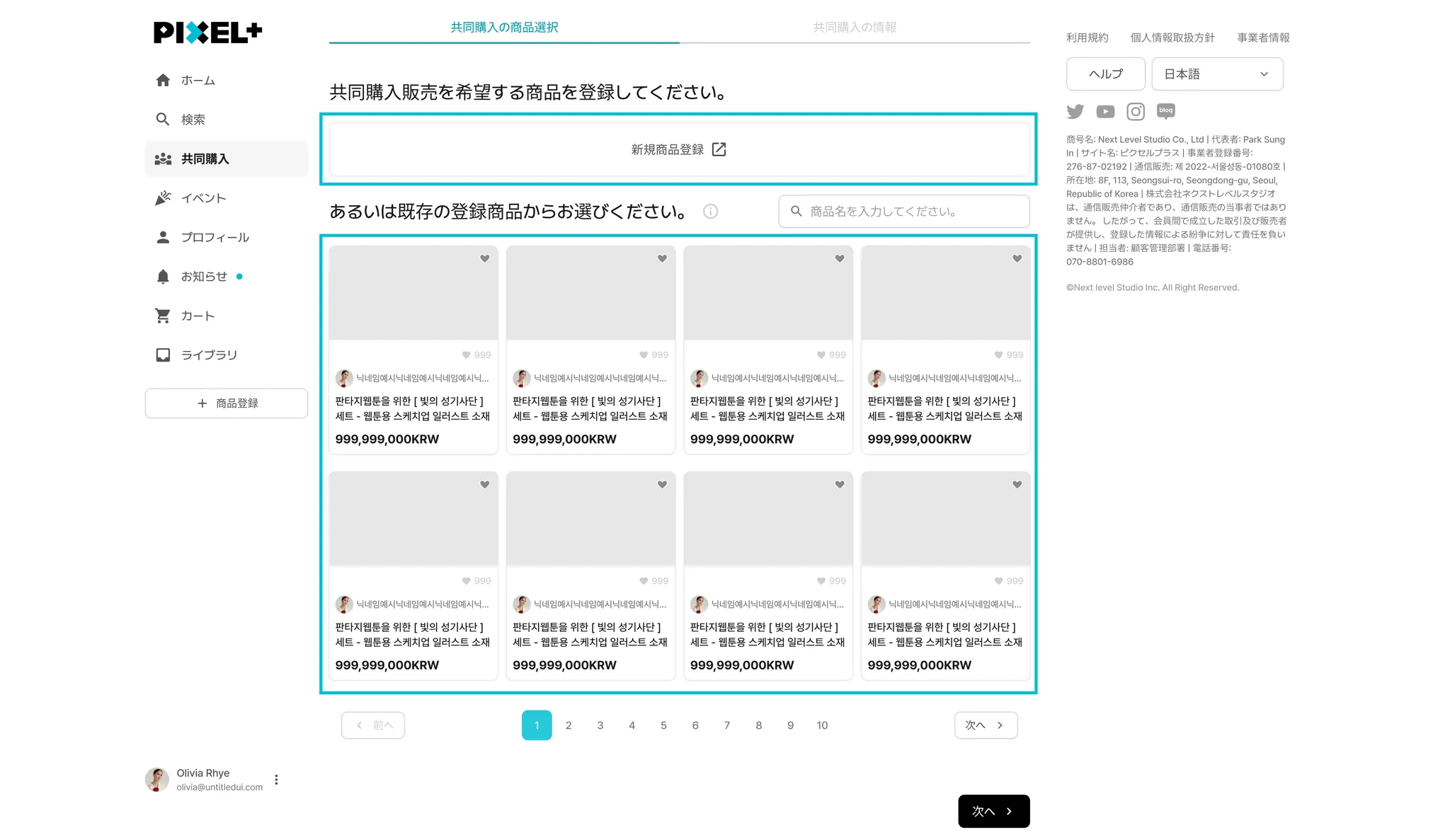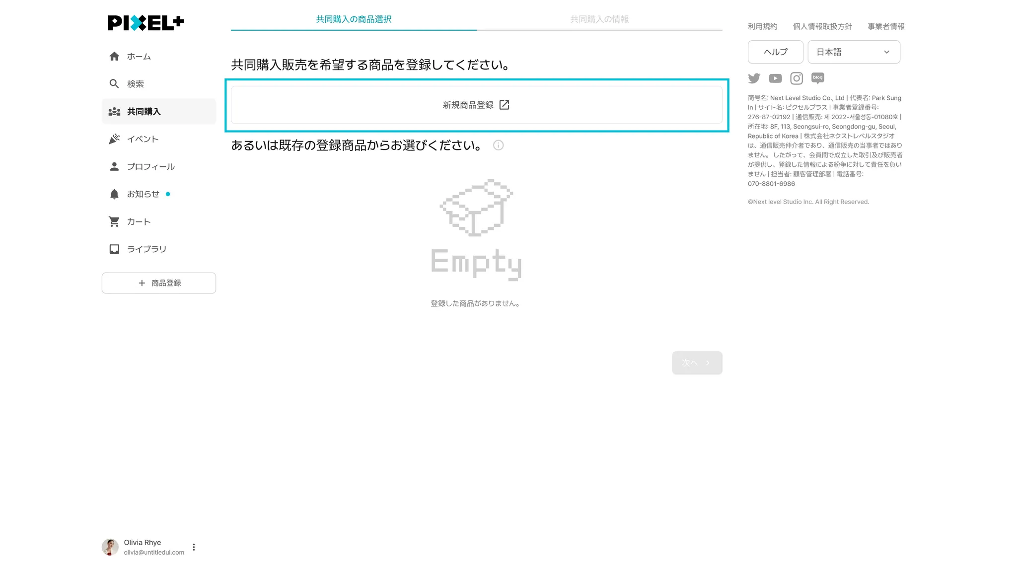 新たに共同購入で販売したい商品がある場合は、[新規商品登録]から商品を登録してください。