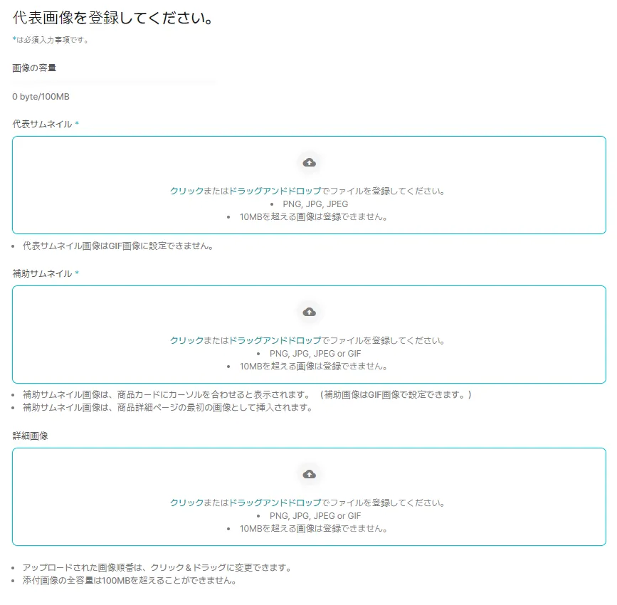 最初に登録されるイメージが商品のサムネイルになる。 その後、登録されるイメージは商品詳細イメージに順番に含まれますよ!