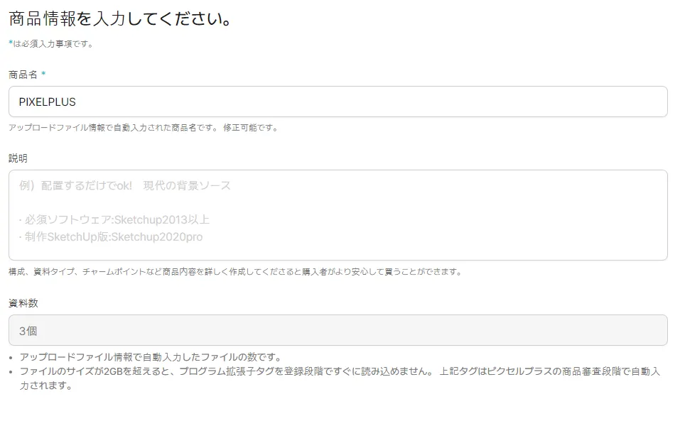 商品名を入れて下さい。 (アップロードされたファイル情報で自動補完されますが、修正できますよ!)
