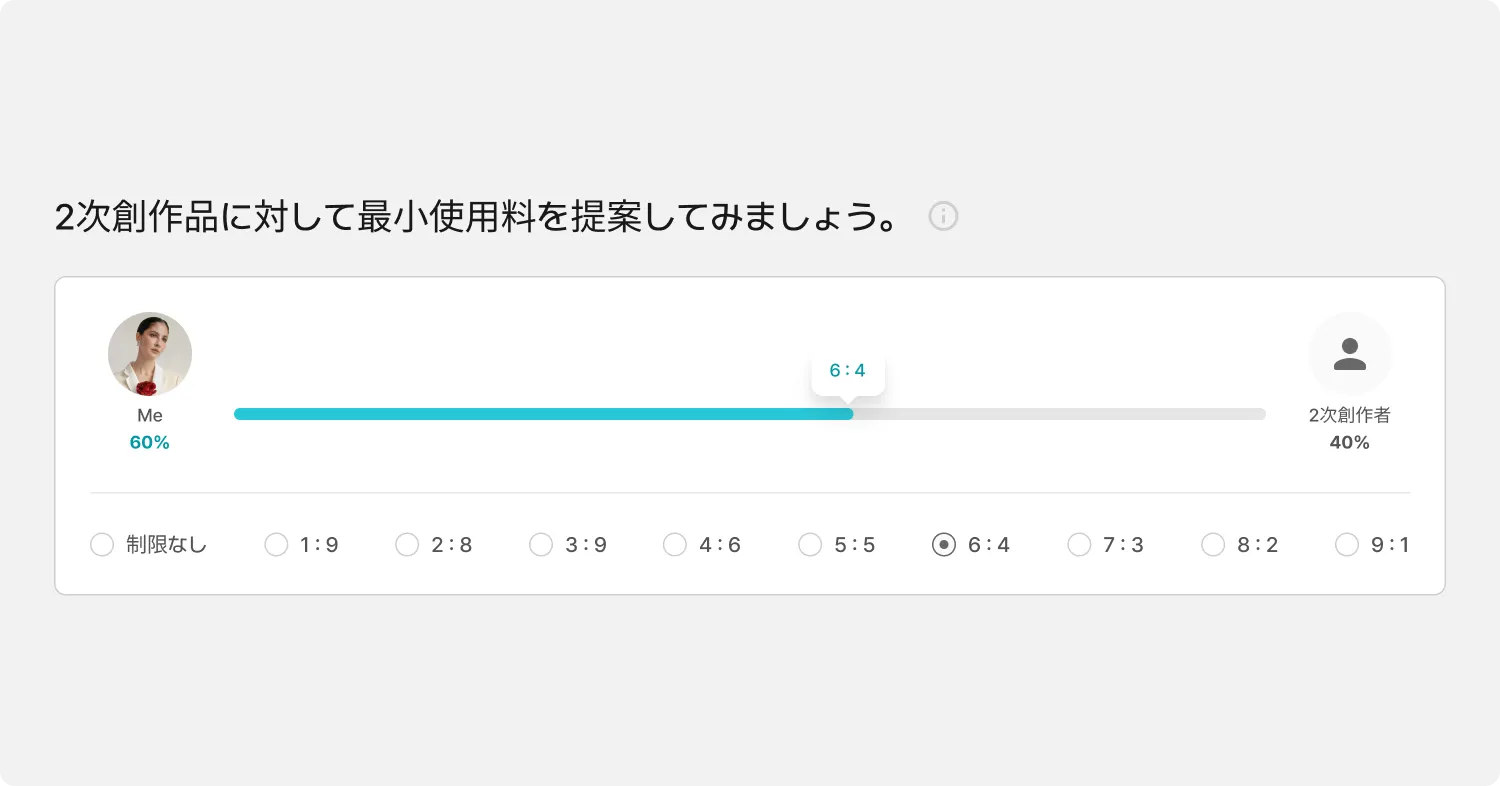 2次創作を許可した場合、2次創作会員と分ける最小収益を決めて下さい。
