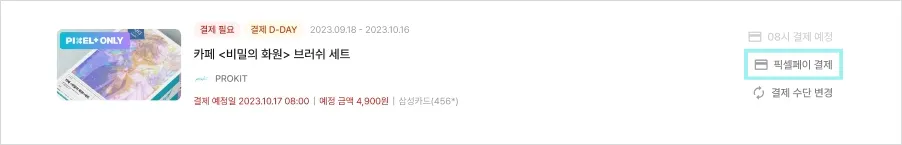 픽셀페이로 결제하신 경우, 10월 17일 오전 8시에 등록하신 수단으로 자동 결제돼요!