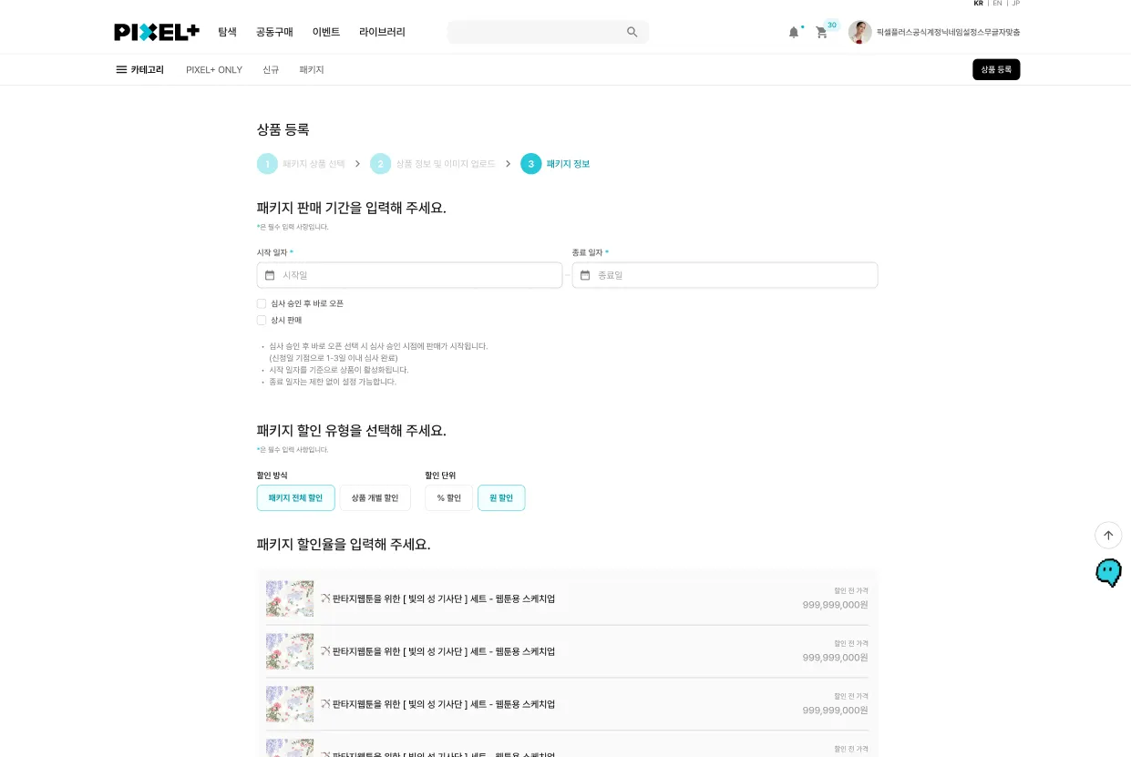 패키지 판매 기간은 시작 일자를 기준으로 상품이 활성화 됩니다.