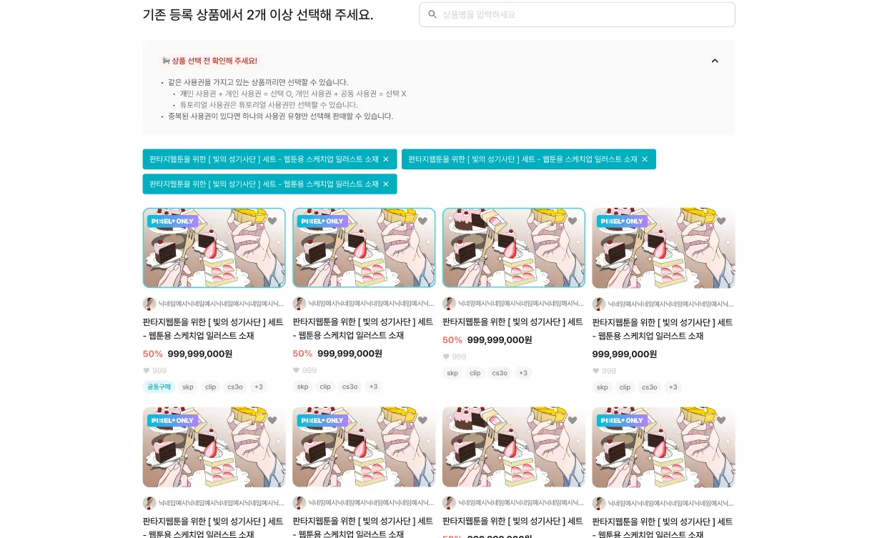 패키지로 묶어서 팔고자 하는 상품을 2개 이상 선택해주세요.
