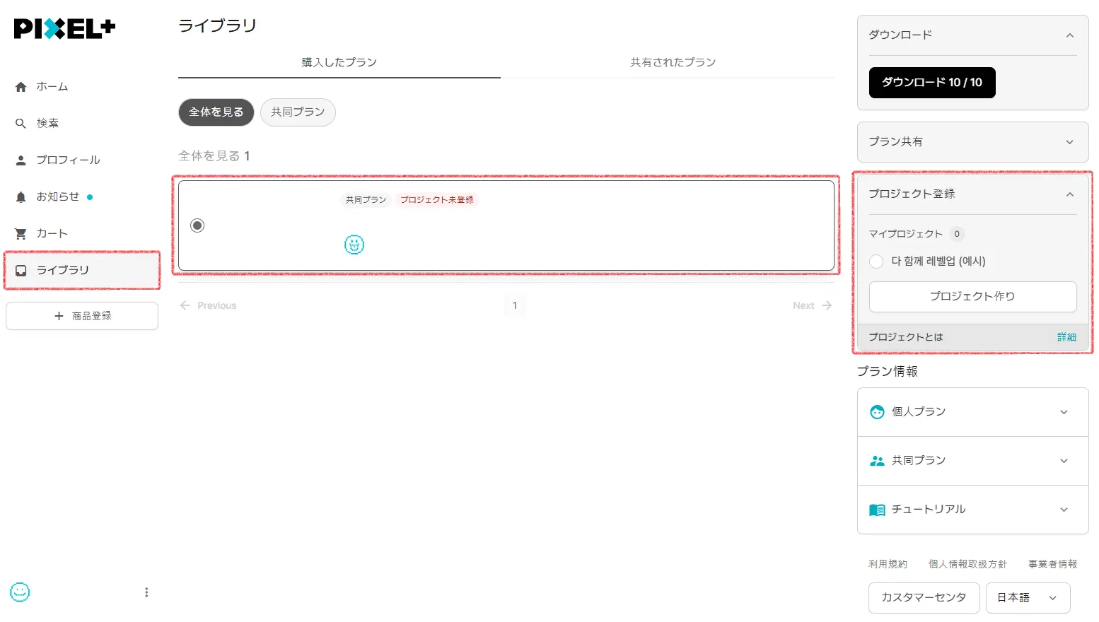 お気に入りの商品のプランを商用利用するには必ず参加中の「プロジェクト」をピクセルブラスに登録する必要がございます。購入者はプランをPIXELPLUSに登録したプロジェクト以外の作品では使用できません。