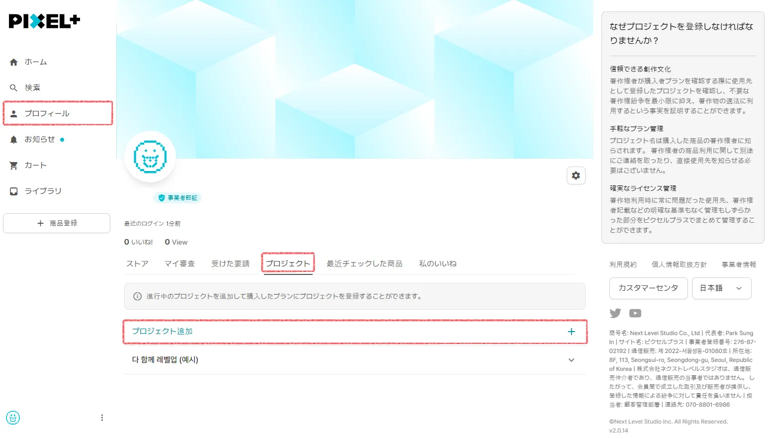 「プロフィール」 → 「プロジェクト」 → 「プロジェクト追加」