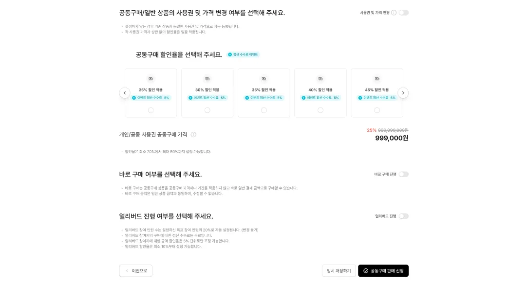 공동구매 신청 시 기존 판매 상품의 가격, 판매 가능한 사용권을 변경할 수 있습니다.