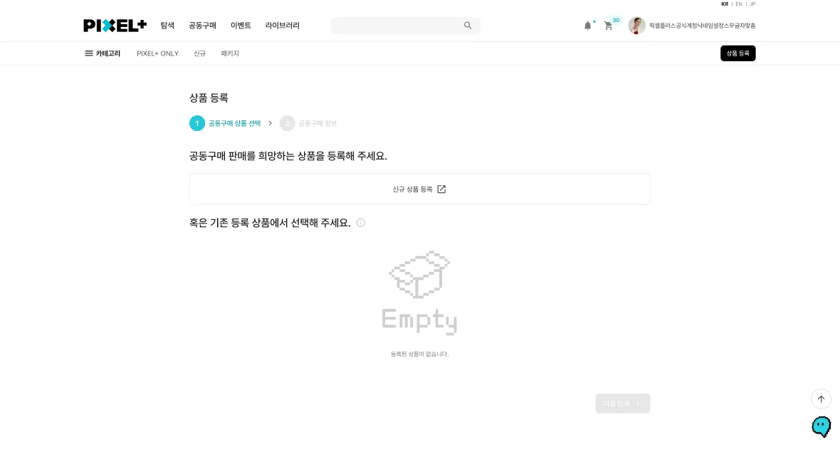 새롭게 공동구매로 판매하고자 하는 상품이 있으시다면 [신규 상품 등록]을 통해 상품을 등록해주세요!