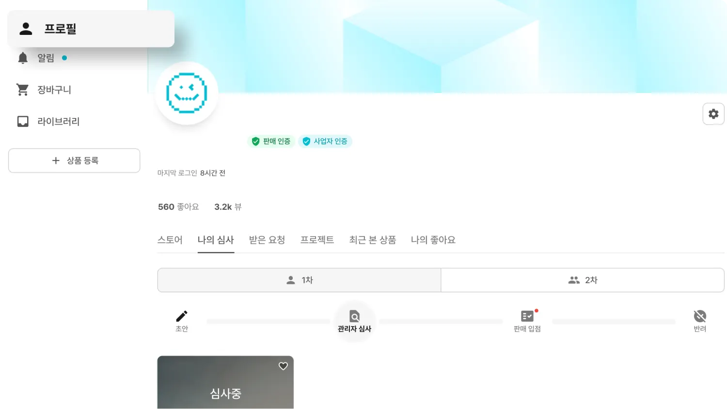 심사중인 상품은 [마이페이지] > [판매자 모드] > [나의 상품]에서 확인할 수 있어요!