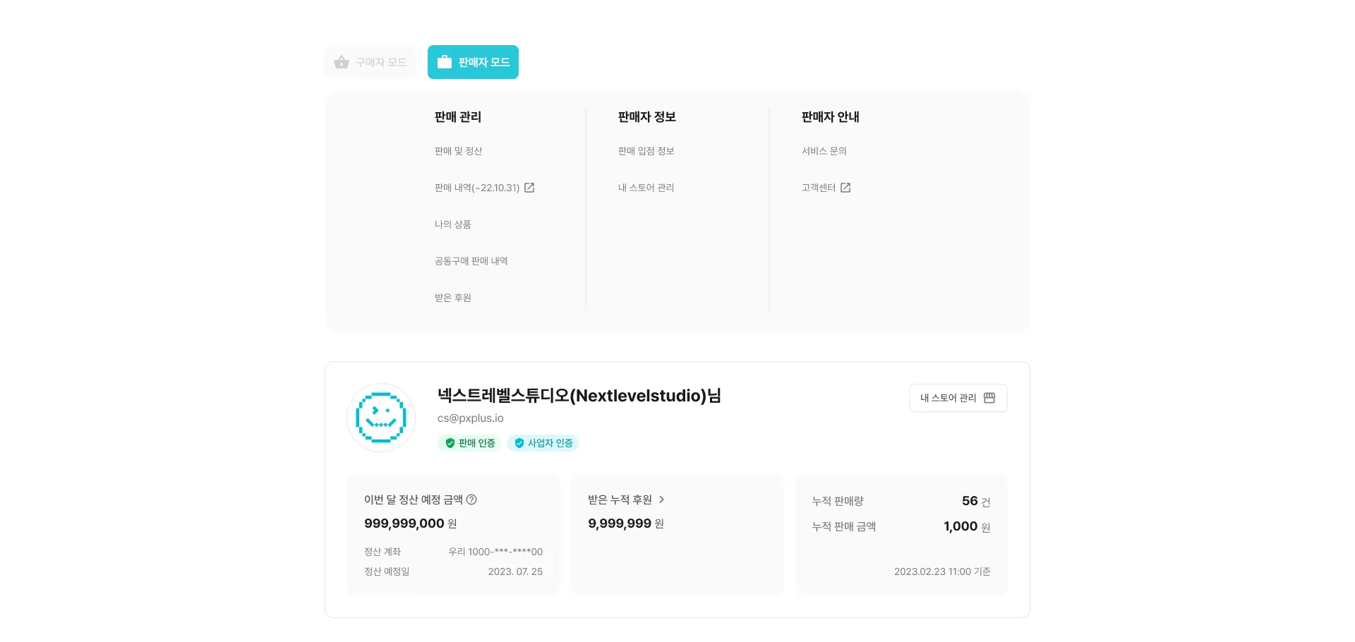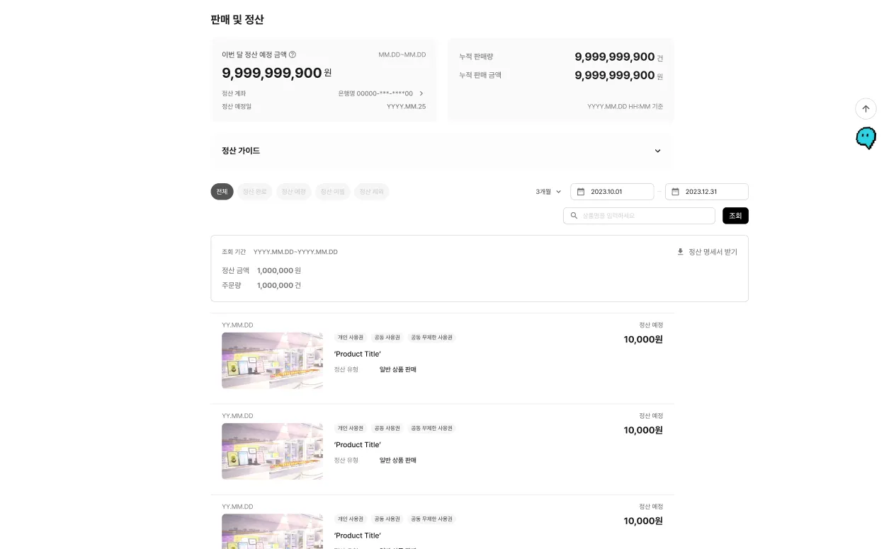 [마이 페이지] > [판매자 모드] > [판매 및 정산] 탭에서 정산 예정 금액을 확인할 수 있어요!