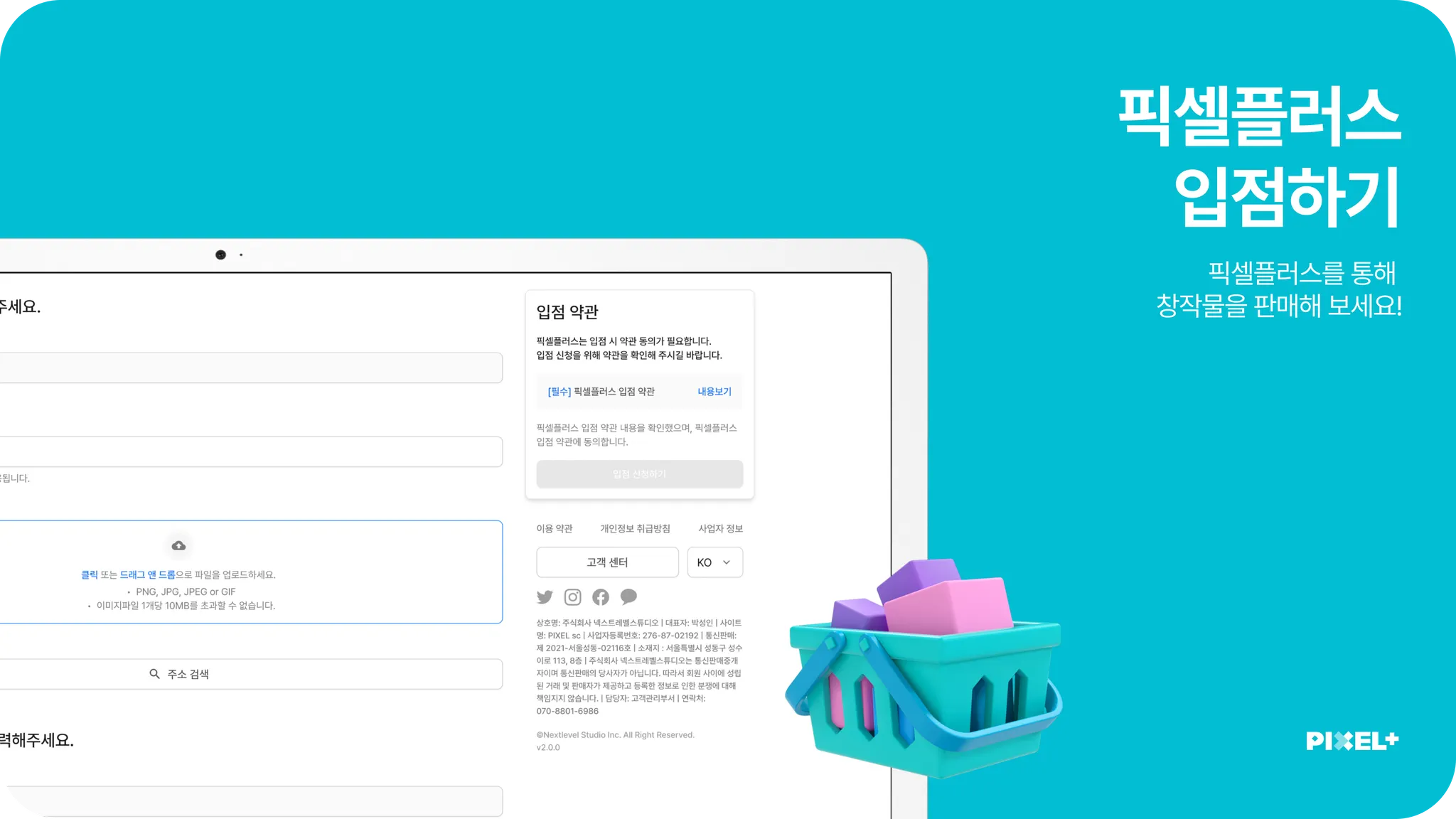 픽셀플러스 입점 약관을 확인하고 [입점 신청하기]를 통해 입점 신청을 완료합니다.
